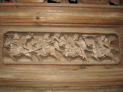 A relief sculpture which tells a story about “The Three Brothers Fight against Lvbu” happened in Three Kingdom Period is seen on the window of an ancient house of Luotian Village. [chinadaily.com.cn]