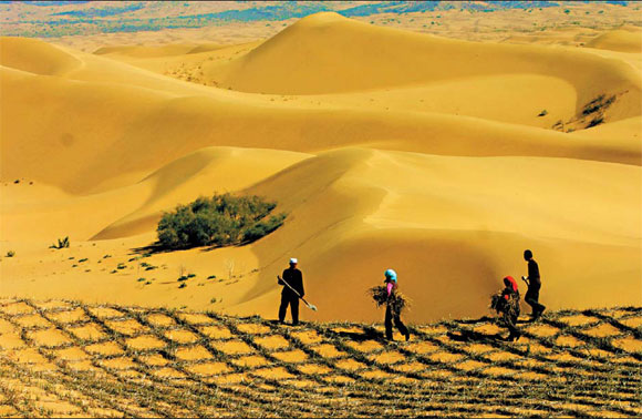 People plant grass in Baijitan in Ningxia Hui Autonomous Region to prevent the desert from spreading further. Desertification has been threatening many places like this in western China, and non-Communist parties have helped the government launch a series of programs to fight the trend.Guo Xulei