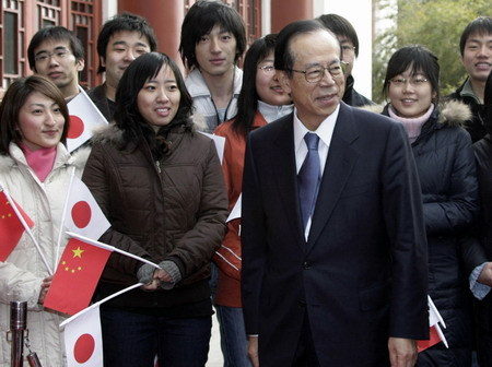 Peking University students meet Japanese Prime Minister Yasuo Fukuda (C) on his arrival at the university in Beijing December 28, 2007. Fukuda said that a strategic and mutually beneficial bilateral relationship shall be based on reciprocal cooperation, international contributions as well as mutual understanding and trust. [Agencies]