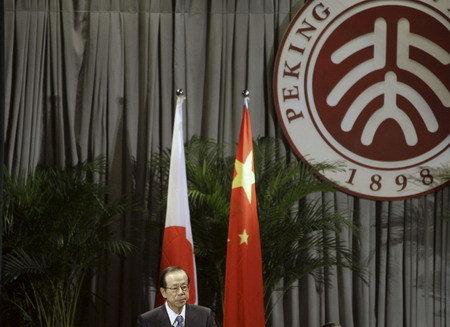 Japan's Prime Minister Yasuo Fukuda delivers a speech at Peking University in Beijing December 28, 2007. Fukuda spared more than 40 minutes to speak at Peking University, where he projected a warmer bilateral relationship to 600-odd Chinese students with his sincerity and humor. [Agencies]