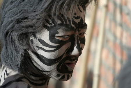 A man of the Tu ethnic group is seen before performing "Wutu" dance during a ceremony at Nianduhu village in Tongren county, Qinghai province, December 29, 2007. The annual ceremony is held to dispel diseases and exorcise evils. "Wutu" is an equivalent to "tiger" in the dialects of ancient Chinese. Picture taken December 29, 2007. [Agencies]