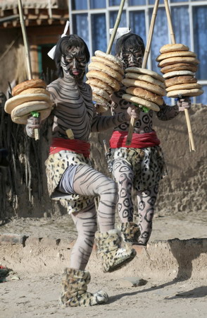 People of the Tu ethnic group perform the "Wutu" dance during a ceremony at Nianduhu village in Tongren county, Qinghai province, December 29, 2007. [Agencies]