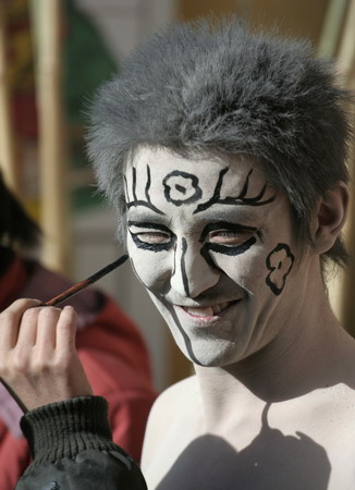 A man of the Tu ethnic group is painted before performing the "Wutu" dance during a ceremony at Nianduhu village in Tongren county, Qinghai province, December 29, 2007. The annual ceremony is held to dispel diseases and exorcise evils. "Wutu" is an equivalent to "tiger" in the dialects of ancient Chinese. [Agencies]