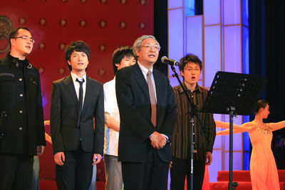 Xu Zhihong, president of Peking University, performs an encouraging pop song at the school's New Year party on December 31, 2007. [China Photo Press]