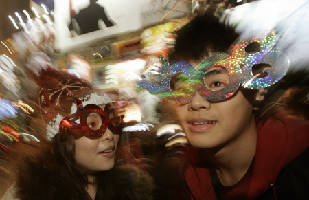 Revellers celebrate at Times Square as they take part in the 2008 New Year countdown in Hong Kong December 31, 2007. [Agencies]
