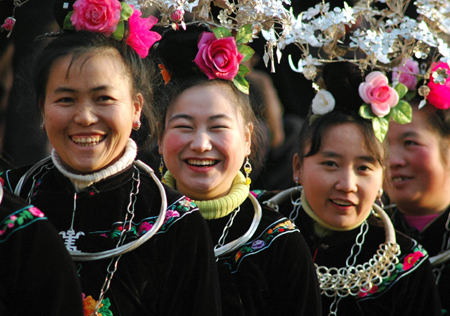 Women of the Miao ethnic group wearing traditional ethnic costume perform the Lusheng dance to celebrate the New Year at Yangpai Village of Leishan County, Southwest China's Guizhou Province, January 1, 2008. Lusheng is a distinctive musical instrument which is made of bamboo tubes. Their celebrations for New Year started from December 26, 2007 and will end on Wednesday. [Xinhua]