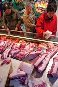 Customers buy pork at a supermarket in Yinchuan, Northwest China's Ningxia Hui Autonomous Region in this October 10, 2007 photo.