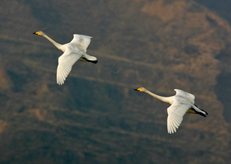 Two swans fly over Shengtian Lake in a provincial wet land reserve of North China's Shanxi Porvince January 3, 2007. Thousands of swans fly to the reserve to live through the winter, making the lake a "swan lake". [Xinhua]