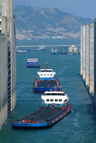 Freighters pass a ship lock at the Three Gorges Dam in Central China's Hubei Province in this photo taken on April 30, 2007. Cargo transport through the Three Gorges Dam increased 21.3 percent to 60.56 million tons last year from 2006, thanks to the heightened water levels on the upper reaches of the Yangtze River after the dam was put to use, according to figures released by the China Yangtze River Three Gorges Project Development Corporation. [Xinhua]
