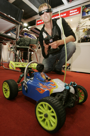 Updated: 2008-01-08 11:38 ![]() Gregory French of Process Solutions poses with his latest product, made by a Chinese toy manufacturer, which features a CMOS camera linked to an RC radio with integrated head tracking, at the annual Toys and Games Fair in Hong Kong January 7, 2008. The fair features more than 2,000 exhibitors from 36 countries and regions. [Agencies] |