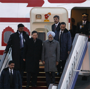 Indian Prime Minister Manmohan Singh (3rd R) arrives at Beijing International Airport January 13, 2008. [Agencies]