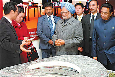 Hours after landing in the chilly morning, the 76-year-old leader visited Beijing's Olympic Project Exhibition Center, beside the iconic Bird's Nest, which displays models of the main sports venues in the Olympic Village. After about half an hour's tour in the center accompanied by Chen Gang, vice-mayor of Beijing, Singh said he was impressed by the "inspiration and talent" of the Chinese. "I congratulate the people of China on the remarkable progress they have made in preparing for the Olympics in August," said Singh, wearing a blue turban and clad in a gray overcoat. He said that Beijing's preparations for the Games are a source of inspiration for India, which will host the 2010 Commonwealth Games. The infrastructure and other work Beijing has done for the Olympics merit attention from the Indian people while preparing for big events like the Commonwealth Games, he added. After the visit, Singh wrote in the guestbook: "On behalf of the government and people of India, I extend my best wishes for the success of the Olympic Games in Beijing. I hope that the Olympic spirit and the warmth of the great city of Beijing will promote friendship, peace and understanding among all the participants and the countries they represent." Hu Yisha, a guide at the center who accompanied Singh's entourage, said the Indian prime minister looked and listened attentively. "For example, when Vice-Mayor Chen said it would be a big problem to maintain the sports venues after the Games in such a populous city, Singh seemed to readily acknowledge that," said Hu. The trip to the Olympic center was yesterday's only public activity for Singh, who is accompanied by more than 50 journalists and about 40 high-level business leaders on his visit, during which he hopes to impart "substantive content" between the world's two most populous countries. Premier Wen Jiabao hosted a private dinner for Singh at the Diaoyutai State Guesthouse last night. The two leaders will hold formal talks today and also attend the foundation ceremony of a China-India joint medical team. Singh will deliver a speech, to be broadcast live, at the Chinese Academy of Social Sciences tomorrow morning, and meet with President Hu Jintao and top legislator Wu Bangguo in the afternoon. The two countries are expected to sign agreements in fields as diverse as land management, housing, traditional medicine, railways and geosciences during the visit. In an interview to Xinhua before the trip, Singh said he came to China "with a view to shaping a relationship that befits our two countries and our future generations". Analysts believe Singh's visit can be a pivot on which the dragon and the elephant will dance more closely on the global arena. "India-China relations have today transcended their bilateral dimension and have acquired global and strategic significance," Singh told Xinhua.