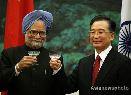 Chinese Premier Wen Jiabao (R) toasts with visiting Indian Prime Minister Manmohan Singh after a signing ceremony at the Great Hall of the People in Beijing January 14, 2008. Wen said that Sino-Indian relations face important strategic chances as he met with the Indian Prime Minister. [Asianewsphoto]