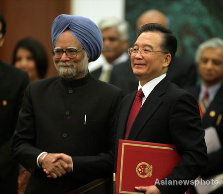 Chinese Premier Wen Jiabao (R) and visiting Indian Prime Minister Manmohan Singh shake hands after a signing ceremony at the Great Hall of the People in Beijing, January 14, 2008. Wen said that Sino-Indian relations face important strategic chances as he met with the Indian Prime Minister. [Aianewsphoto]