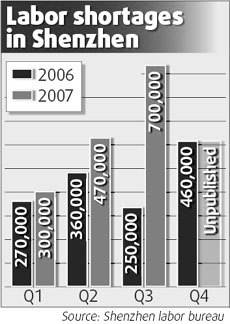 Jia, who is in his late 20s and has worked in Shenzhen for close to four years, said the power equipment company for which he works has defaulted salaries for over- five months. "Some of my colleagues are willing to kneel down and beg for their salaries. "They have rent to pay and need the money simply to survive," Jia told China Daily. Jia said his colleagues are used to the private company defaulting on wages, which are usually delayed by two or three months, but they are finding it harder and harder to wait. "Although our country has enacted labor laws to protect workers, the large majority of companies are privately run and employees' rights and interests are not always guaranteed," the engineering graduate said. While seeking legal advice to get back the money owed him, Jia said he is trying his luck in other mainland cities like Shanghai, or might even move back to his hometown in the northeast. He is among a growing number of workers who are leaving or thinking of leaving the city for better prospects. Li Jian, who works as a legal consultant to an electronics company, said the management has asked him to legalize its payment system in an attempt to keep workers. "Workers at my client's company have left in their hundreds," he said. "Previously, the management offered pay in accordance with the city's minimum wage but did not pay for overtime. "But they were forced to legalize the payment system given workers' greater awareness of the labor law and rising pressure to retain staff." Li said Shenzhen's competitiveness in attracting labor is actually lower than that in many other mainland cities. A survey conducted by the Southern Metropolis Daily showed 18 percent of the city's migrant workers decided to leave for good. A social security management branch in Longgang district, where most of the city's labor-intensive industries are located, said more than 40,000 people withdrew from the social security system last year, meaning they did not intend to stay long in the city. The situation in Shenzhen, which has been suffering from labor shortages since 2005, might get even worse after the Lunar New Year holiday, the newspaper forecast. According to the Shenzhen labor authority, the shortage grew to about 700,000 in the third quarter, up from 470,000 in the second quarter. Mi Guochen, a press official with the Shenzhen labor bureau, said figures for the fourth quarter will be released next week and the gap is expected to have narrowed. "It's hard to make any predictions on the labor market because many complicated elements are involved," Mi told China Daily. (China Daily 01/18/2008 page4) |