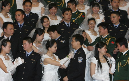 Grooms and brides prepare before a group photo during a mass wedding where 100 police couples tied the knot in Beijing, January 17, 2008. The Ministry of Public Security hosted a mass wedding ceremony for the 100 police couples who met each other in the line of duty at stations around the country. [Xinhua]