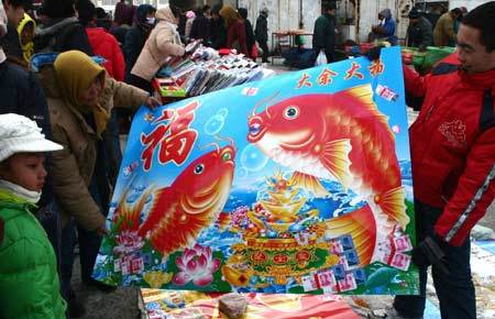 Updated: 2008-01-21 14:56 ![]() Villagers select new year pictures at a country fair in Ganjingzi district of Dalian, a coastal city of Northeast China's Liaoning Province, Jan. 20, 2008. Residents purchased various propitious New Year paintings for the forthcoming Spring Festival falls on Feb. 6, 2008. [Xinhua] |