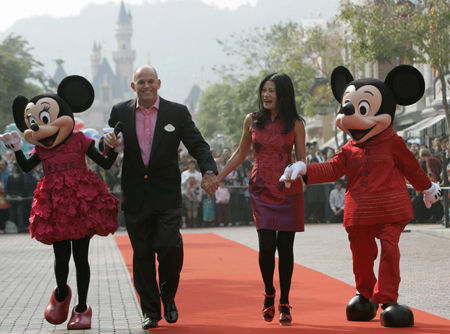 People dressed as cartoon characters Mickey and Minnie, Executive Vice President and Managing Director of Hong Kong Disneyland Bill Ernest (2nd L) and Hong Kong designer Vivienne Tam (2nd R) greet visitors at Hong Kong Disneyland January 21, 2008. The new costumes of Mickey and Minnie, along with other activities, form the "Year of the Mouse Celebration" held by the entertainment theme park for the upcoming Lunar Year of the Rat. [Agencies]