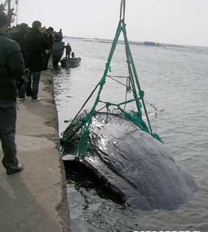 People crowd to see the dead whale that is found in a fishing dock in Shandong on Sunday, Jan. 20, 2008. [Xinhua]