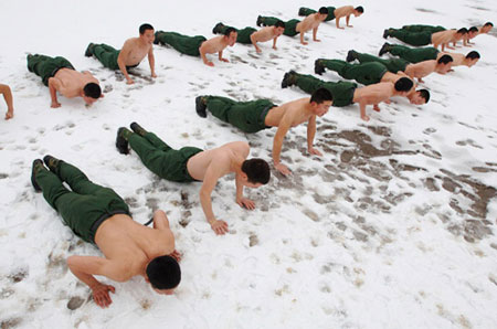 Stripped to the waist, armed police officers take exercise against the skin piercing wind in Hefei, capital of East China's Anhui Province, Jan. 21, 2008. [china.org.cn]