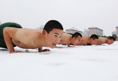 Stripped to the waist, armed police officers take exercise against the skin piercing wind in Hefei, capital of East China's Anhui Province, Jan. 21, 2008. [china.org.cn]