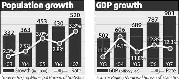 Figures released yesterday by the Beijing statistics bureau show the number of residents in the capital was 16.33 million at the end of last year, including 12.13 million with hukou (household registration) and about 4.2 million migrant workers. Yu Xiuqin, a spokeswoman for the bureau, said the population was predicted to reach 16 million by 2010. Last year's total was up 520,000 on 2006, the biggest annual increase in six years. "This year, we will still face the pressures of a growing population," she said, adding that the city government had predicted the number to hit 18 million by 2020. Wang Haiping, deputy director of the municipal development and reform commission, said Beijing had become a magnet for migrant workers because of its plentiful work opportunities. The city's Acting Mayor Guo Jinlong said this week the "resource and environmental problems" created by the soaring population were among its "most pressing issues". However, Wang made it clear at yesterday's press conference the government "will not impose compulsory administrative measures to prevent people from entering". "That is an out-of-date approach," he said. "Instead, we'll look to develop the city's vast suburbs and countryside to attract more migrants there." In response to a question about whether the economy in Beijing will fall into recession after the Olympics, as has happened in other host cities, Wang said the so-called "post-Olympics" phenomenon will not affect Beijing. He said a comprehensive study had concluded the economy will remain healthy and stable after the Games. "Different from other cities that have experienced such a phenomenon, Beijing will have a new economic driving force in its rapid developing suburbs and countryside," Wang said. Growing consumption and a booming national economy are also major supportive factors, he added. Zhang Gong, director of the municipal development and reform commission, said this week the government will strike a balance between investments before and after the Games to prevent economic decline. Beijing has forecast 9 percent annual economic growth over the next five years, with per capita GDP expected to grow from the current $7,000 to $10,000 over the same period, according to the city's government report released on Sunday. In the past five years, the city saw annual growth of 12 percent. Possible inflation Yu with the Beijing statistics bureau yesterday also warned of possible inflation in the capital this year. The CPI (consumer price index) in Beijing rose 2.4 percent last year, about half the national average. The government's work report plans to limit CPI growth in Beijing to within 3.5 percent by the end of the year. But with prices continuing to soar nationwide and labor costs also rising, Yu said the city faces a "stern" task. |