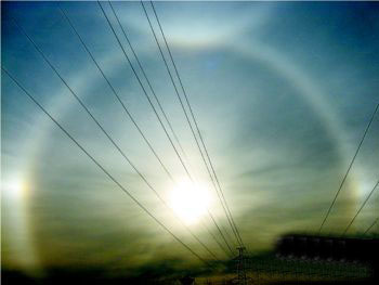 Solar halos appear in the sky of Beijing Friday morning, January 25, 2008. The solar halos, which amazed many locals, formed when light from the sun is refracted by ice crystals associated with high-level clouds, experts said.[Sohu.com]