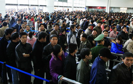 Passengers queue at the Fuzhou Railway Station to buy or refund tickets after the bad weather blocked trains arriving in Fuzhou, East China's Fujian Province, January 27, 2008. China issued a weather alert as widespread heavy snow that has blanketed central, eastern and southern parts of the nation is forecast to continue this week. [Xinhua]