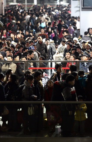 Passengers queue at Shanghai's South Railway Station, waiting to get on the trains while more than twenty trains are delayed in the bad weather, January 26, 2008. China issued a weather alert as widespread heavy snow that has blanketed central, eastern and southern parts of the nation is forecast to continue this week. [Xinhua]