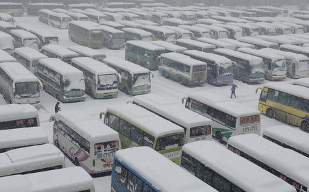 Inter-provincial buses are parked at a bus station due to heavy snowfall in Hefei, East China's Anhui Province January 27, 2008. China issued a weather alert as widespread heavy snow that has blanketed parts of the nation is forecast to continue this week. [Agencies]