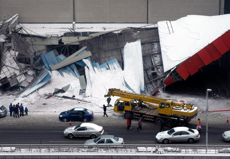Accumulated snow crushes the roof of a gas station in Wuhan, Central China's Hubei Province January 27, 2008. China issued a weather alert as widespread heavy snow that has blanketed central, eastern and southern parts of the nation is forecast to continue this week. [Xinhua]