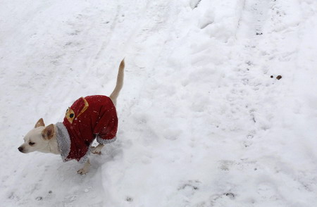 A pet dog wearing a costume runs on the snow in Hefei, East China's Anhui Province January 27, 2008. China issued a weather alert as widespread heavy snow that has blanketed parts of the nation is forecast to continue this week. [Agencies]