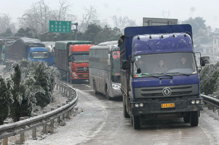 Trucks line up at the Hunan section of Jing-Zhu Expressway (Beijing-Zhuhai) January 27, 2008. More than 20,000 coaches and over 60,000 passengers were affected by the freezing weather which paralyzed the trans-provincial highways. [Xinhua]