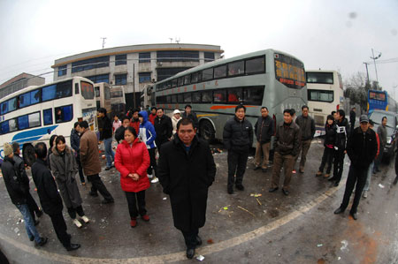 Passengers wait outside the stranded coaches at the Hunan section of Jing-Zhu Expressway (Beijing-Zhuhai) January 27, 2008. More than 20,000 coaches and over 60,000 passengers were affected by the freezing weather which paralyzed the trans-provincial highways. [Xinhua]