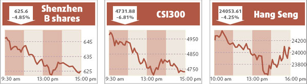 Updated: 2008-01-29 07:16 ![]() ![]() China's insurers, among the world's most valuable after reaping record gains from a stock rally, fell by the 10 percent daily trading limit yesterday as the benchmark Shanghai Composite Index plunged 7.19 percent to a nearly six-month low. China Life Insurance Co, the nation's largest insurer, closed at a seven-month low of 41.04 yuan. Ping An Insurance (Group) Co and China Pacific Insurance Group Co also dropped by the daily limit to close at 72.53 yuan and 35.83 yuan respectively. Domestic insurers risk "massive" redemptions and liquidity difficulties should markets slump, the industry regulator warned on Jan 25. "Once the capital market heads for a downturn, we will suffer very badly and face huge risk," said Wu Dingfu, chairman of the China Insurance Regulatory Commission. "There can be massive redemptions and insurers may face liquidity difficulties." China Life and rivals earned a record 279.2 billion yuan from investment returns last year, more than the previous five years combined. The gains underscore the industry's dependence on a stock market that has lost 20 percent from its Oct 16 peak after surging more than sixfold in the previous two years. China's brokerages, another sector closely linked to the performance of the stock market, also fell by the daily limit.