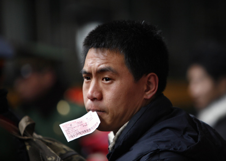 A migrant worker holds his train ticket in his mouth as he stands in a queue on a platform at Shanghai Train Station January 28, 2008. The snow has struck as tens of millions of Chinese crowd home to celebrate the Spring Festival, or Lunar New Year, which starts on February 7 this year, an annual migration that strains train and plane services at the best of times. [Agencies]