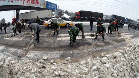 "The situation is improving based on information sent from the provinces," said ministry spokesman Wu Heping at a press conference. "One of the key tasks now is to reopen the expressway linking Beijing with Zhuhai City in the southern Guangdong Province." The north-south trunk road remained blocked at several sections. Disasters caused by prolonged low temperature, icy rain and heavy snow have killed 38 people in China since January 10, including three electricians who fell from a collapsed power pylon while working to restore power supply cut off by heavy snow, according to the Ministry of Civil Affairs on Wednesday. Altogether 17 provinces, autonomous regions and municipalities have been affected, the Ministry said. The expressway section running through the central Hunan Province has 116 km of frozen road and vehicles are moving at a speed of five km an hour, Wu said. "So far, about 6,400 vehicles with more than 10,000 passengers are still on the road," he said. The whole of Hunan has been gearing up to restore traffic. More than 100,000 soldiers and armed policemen, 20,000 government officials, 7,000 police, 2,400 transport officials and 40,000 citizens are working to de-ice the expressway. "But we shall prepare for tougher situations as the weather forecast says it will continue raining and snowing for the next seven days in Hunan," Wu said. The expressway section in Hubei Province north of Hunan has witnessed about 5,000 vehicles moving slowly over a distance of 25 km. Meanwhile, the expressway in Guangdong south of Hunan has about a 20-km stretch of frozen surface. Vehicles heading south on the expressway have begun moving forward at a snail's pace while the lanes heading north remain closed. They are expected to reopen on Wednesday. Along the highway linking the eastern Anhui Province with neighboring Zhejiang Province, about 6,000 vehicles and more than 20,000 people are still trapped, Wu said. In the eastern Jiangxi Province, about 8,000 vehicles and 20,000 people are stranded along the highway linking its two major cities, Nanchang and Jiujiang. Traffic in the southern Guangxi Zhuang Autonomous Region has been totally restored, Wu said. Unexpected freezing weather, heavy snow, sleet and ice rain hit 14 provinces in central and south China in the past week. More than 77.8 million people had been affected by Monday afternoon, according to the Ministry of Civil Affairs. |