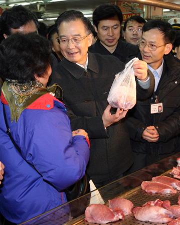 Updated: 2008-01-30 17:01 ![]() Chinese Premier Wen Jiabao talks to a customer in front of a butcher's stall as he inspects the food supply in a market in Guangzhou, South China's Guangdong Province, January 30, 2008. Wen first visited stranded passengers at a railway station in Guangzhou, after continuous heavy snow paralysed road and railway traffic in central and southern parts of China. [Xinhua]
