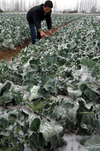 A farmer works in his snow and ice-wracked vegetable plot in Nanchang of Jiangxi Province January 29, 2008. More than 8 million mu of crop was affected across the province by the recent freezing temperatures. [Xinhua]