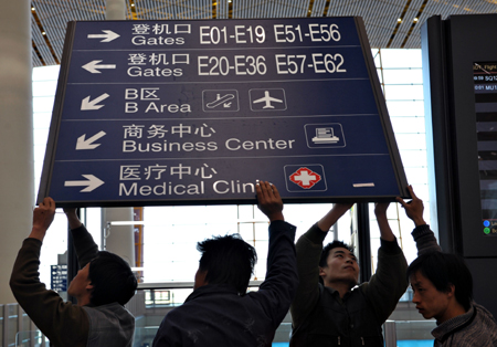 Works install a sign board at the Passenger Terminal 3 of Beijing Capital International Airport, January 30, 2008. [Xinhua]