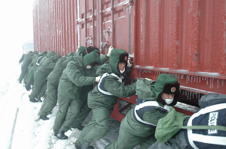 Updated: 2008-02-01 00:29 ![]() Soldiers push a container truck stranded on a snow-plagued stretch of the Beijing-Zhuhai Expressway in Shaoguan, South China's Guangdong Province, January 31, 2008. [Xinhua]