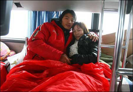 Hu Yuan and his bride Re Wene pose in a snow stranded coach on Jingzhu Highway in south China's Guangdong Province. [xkb.com.cn]