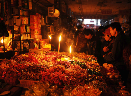 Local residents buy candies for the upcoming Spring Festival in Chenzhou, Central China's Hunan Province, February 1, 2008. Power supply in Chenzhou City has been cut off during the past eight days, leaving thousands of households in dark and coldness. [Xinhua]
