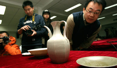 Visitors and photographers show keen interest in precious porcelainwares from an ancient boat in the National Museum of China in Beijing Feburary 1, 2008. The sunken ship, now named the Nanhai No 1 by archaeologists, has been lifted and moved into a crystal palace to excavation. [Xinhua]