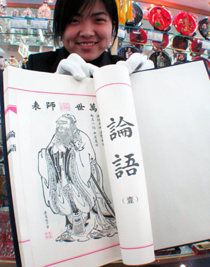 Updated: 2008-02-02 15:29 ![]() An employee of a store shows a silk book "the Analects of Confucius" in Jinan, capital of east China's Shandong Province, Feb. 1, 2008. The book made of white silk with waterproof and mildew prevention technology could be conserved for a long term. [Xinhua] |