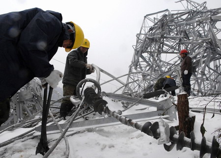 Updated: 2008-02-02 21:48 ![]() Workers fix power cables damaged due to recent snowfall in Changsha, Hunan Province February 1, 2008. China's power shortage reached about 42 gigawatts in late January and hit more than half of the country, the government said on Friday, after harsh winter cut coal shipments to power plants and brought down power cables. [Agencies]