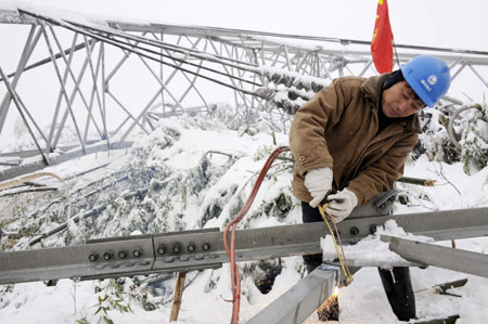 A worker fixes a power cable tower destroyed by heavy snow in Tongshan County of Hubei Province February 2, 2008. [Xinhua