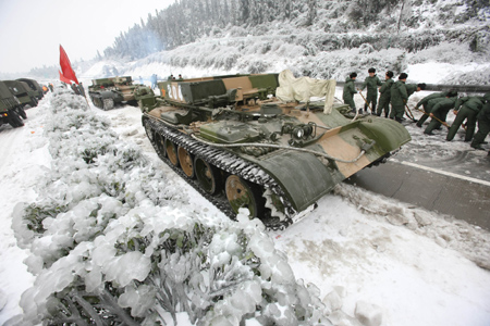 Updated: 2008-02-03 19:30 CHAOHU, Anhui -- The Chinese army has sent out tanks to clean the icy expressways in eastern Anhui Province.