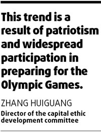 Updated: 2008-02-05 07:43 Less littering, spitting and queue jumping is making the capital a more pleasant place to live, research has revealed. A report by the Renmin University of China, commissioned by the capital ethic development committee, was released on Friday. Zhang Huiguang, director of the committee - a Beijing government etiquette group tasked with helping prepare the city for the Olympics - said: "The behavior of Beijingers in public places is definitely improving. "This trend is a result of patriotism and widespread participation in preparing for the Olympic Games."