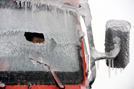 A truck driver peers through a hole in his ice-covered windshield while waiting for help on the road in Shaoguan, South China's Guangdong Province, February 2, 2008. [Xinhua]